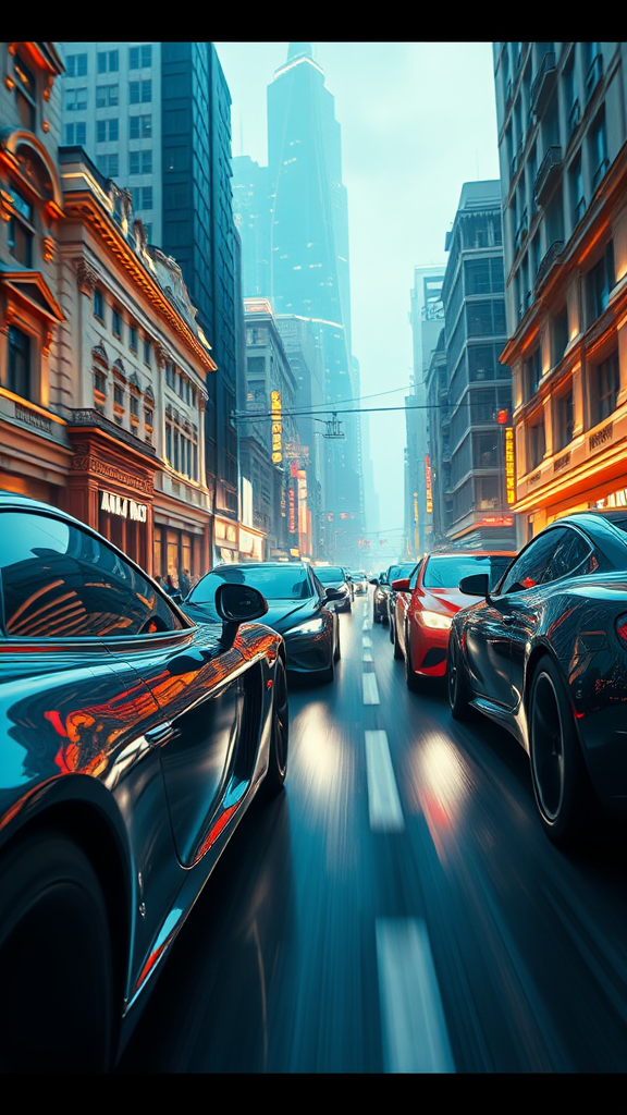 Cinematic 8k wallpaper of sleek cars racing through an intricately detailed futuristic city; the scene captures extreme speed with motion blur and luminous reflections dancing across the polished exteriors of the vehicles. The atmospheric lighting enhances the hyperrealism, showcasing subsurface scattering on buildings with ornate architecture. The composition is intensely cinematic, reminiscent of high-energy promotional art trending on social media platforms like Instagram and Tumblr. Captured with a virtual f/1.8, 85mm lens, the image is ultra-detailed and of the highest quality, resembling VFX post-production with an ultra-realistic touch. Utilizing the power of Unreal Engine 5 for rendering, additional film grain adds texture while Redshift rendering ensures vivid HDR in 4k and 8k resolution. The scene is finished in Cinema4D, perfectly poised as an 8K 3D masterpiece.