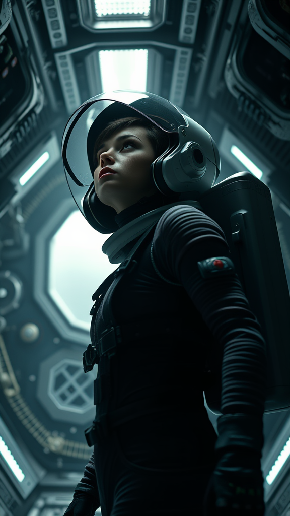 Cinematic 8k wallpaper showcasing Ellen Ripley from the Alien film series, suited in an astronaut outfit with her helmet on and visor closed, gazing upward in a dynamic action stance. She's positioned within the intricate, haunting interiors of the Nostromo space shuttle. The scene embodies sci-fi grandeur, employing advanced Ray Tracing for an ultra-detailed, chiaroscuro effect. Ultra-realistic artistry conveys an epic, stoic atmosphere with movie-quality precision. Overcast reflection mapping enhances depth and realism while highlighting hyper-photorealistic textures. A dramatic rim light accentuates Ripley's determined expression, offering a promotional art feel. The visual captures a timeless cinematic essence, as if shot on a Canon 5D and rendered in Octane, boasting 8K resolution and utmost realism.