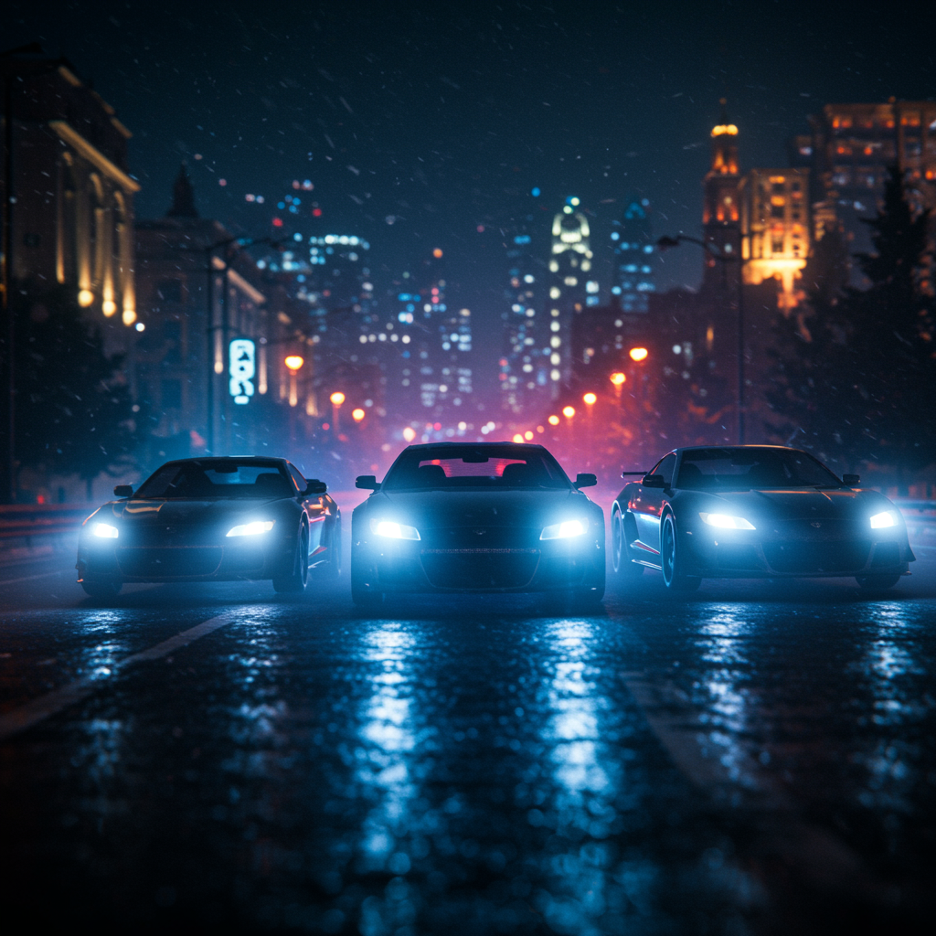 Cinematic 8k wallpaper showcasing three sleek black cars in a highly realistic aesthetic, each with their xenon headlights piercing through the night. The cars, meticulously detailed, are tightly packed in a dynamic race, captured in full view. Set against an ornate, intricately detailed cityscape, the road blurs beneath them, accentuating their speed. This arrangement features a centered composition, highlighting the lumen reflections and casting a dark epic ambiance with atmospheric lighting. Subsurface scattering and hyperrealism enhance the intense cinematic composition, making it ideal for promotional art. Ultra-detailed and post-processed with VFX techniques, it achieves unmatched realism with HDR and 4k/8k quality. Low angle perspective brings the viewer into the action, skillfully rendered using Unreal Engine 5 and Cinema4D with Redshift, emphasizing volumetric lights and overcast reflections for a visually striking scene.