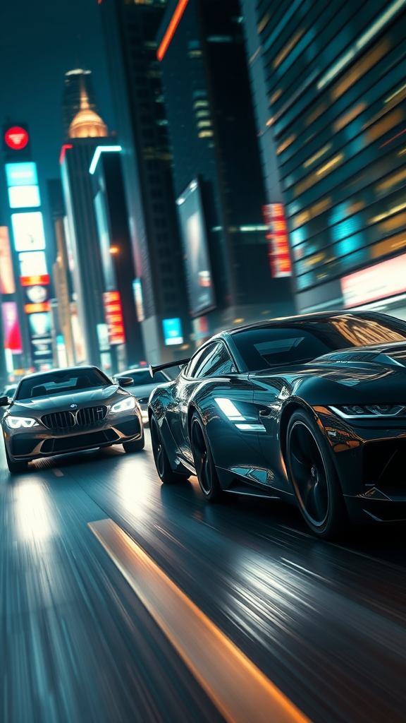 cinematic 8k wallpaper, sleek cars racing at lightning speed, highly detailed, 4k digital art, intricate, vibrant city setting, dynamic motion blur, luminescent reflections, atmospheric glow, subsurface scattering effects, hyper-realistic portrayal, intense cinematic framing, vivid promotional artwork, viral on instagram, popular on tumblr, f/1.8 lens depth, shot with 85mm perspective, super detailed, ultimate quality resolution, ultra-realistic appearance, film-grade visuals, vfx enhanced, hyper-detailed clarity, hd quality, hdr brilliance, 4k, 8k, fluid motion blur, rendered using unreal engine 5, reminiscent of vintage film grain, crafted in Cinema4D, 8K 3D, refined with redshift render.