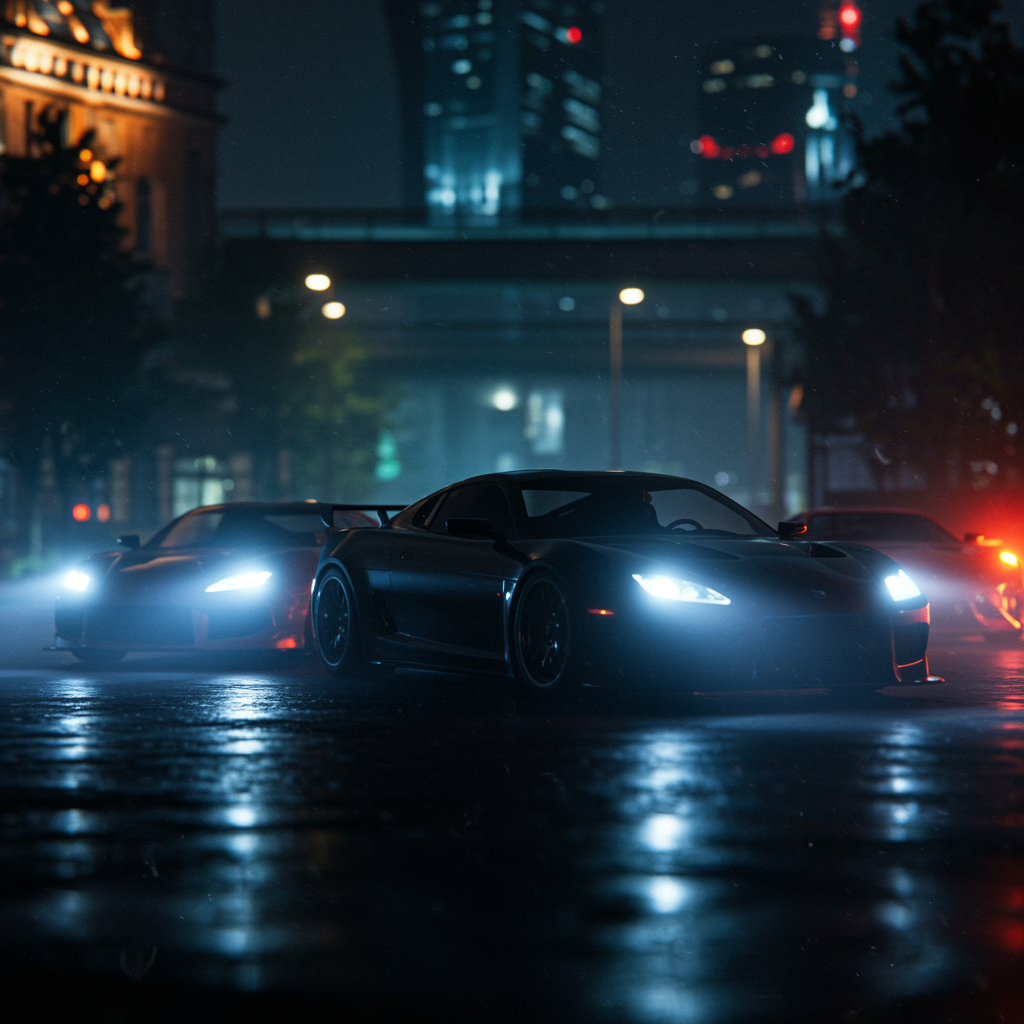 Cinematic 8k wallpaper, three sleek black cars, astonishingly realistic, aesthetic design, xenon headlights casting beams in a tightly knit night race, complete car visibility, extraordinarily detailed digital painting, intricate craftsmanship and embellishments, ornate and intricately detailed cityscape, road blurred in motion, balanced composition, glowing reflections, dark, epic atmosphere, moody lighting, subtle subsurface scattering, hyper-realistic visuals, powerful cinematic framing, promotional quality, ultra-high detail and realism, overcast reflections, dramatic volumetric lighting in a shadowed environment, cinematic, movie-grade visuals, VFX post-enhancement, hyper-detailed, HD, HDR, 4K, 8K, low perspective, Unreal Engine 5 artistry, generated using Cinema4D in 8K 3D, rendered with Redshift, 8K.