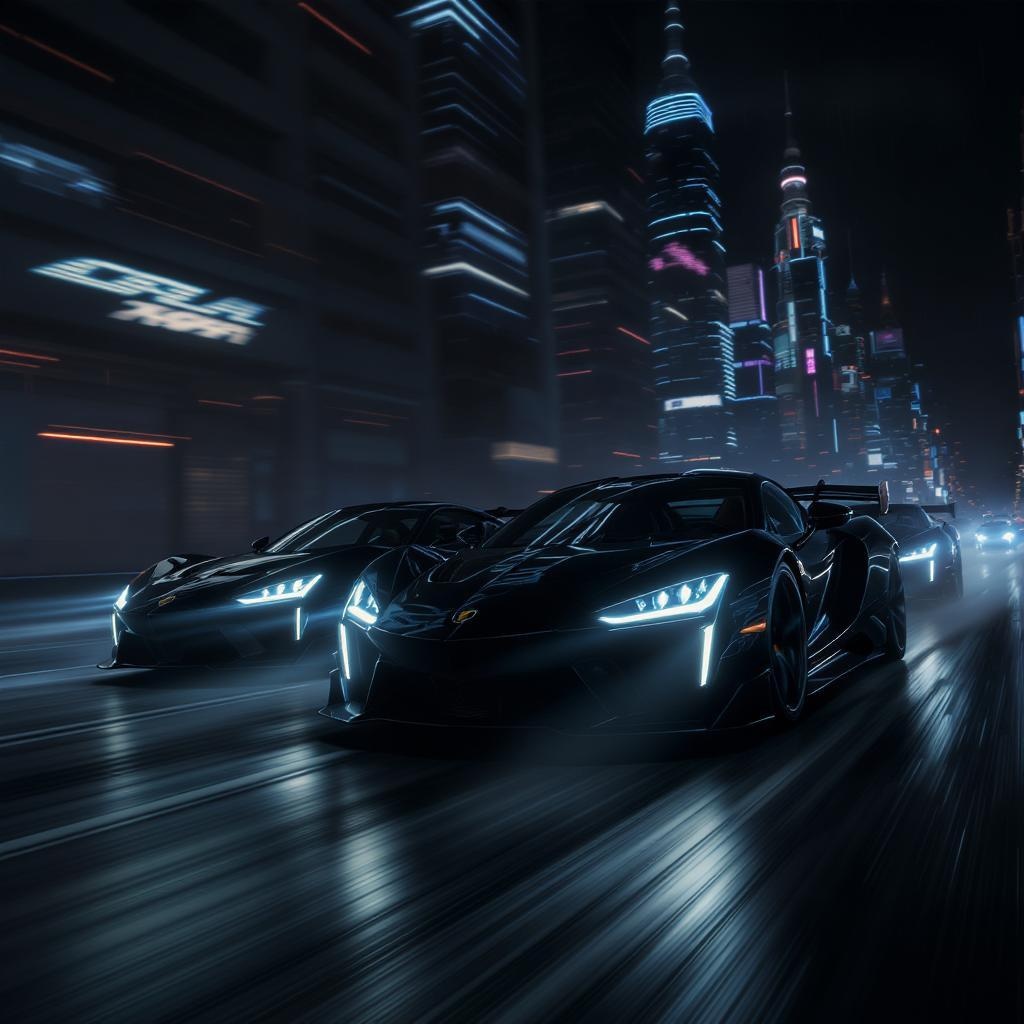 Cinematic 8k wallpaper, three sleek black cars with precise realistic detailing, aesthetic flair, xenon headlights piercing the night, aligned closely in a high-speed race, cars in full view, refined digital painting with intricate craftsmanship, elegant and detailed futuristic cityscape, blurred motion road, centered composition. Luminous reflections dance across surfaces in a dark epic scene, enriched with atmospheric lighting and fine subsurface scattering. Hyperrealistic elements evoke intense cinematic allure, designed for promotional art with ultra-high detail and realism. Overcast reflections and volumetric lighting create depth in the shadowy environment, blending cinematic quality, movie-level VFX post-production. Rendered with exceptional hyper-detail, delivering HD, HDR, 4k, 8k fidelity, utilizing low-angle perspectives, powered by Unreal Engine 5 and Cinema4D. Redshift rendering in 8K offers a breathtakingly immersive visual experience.