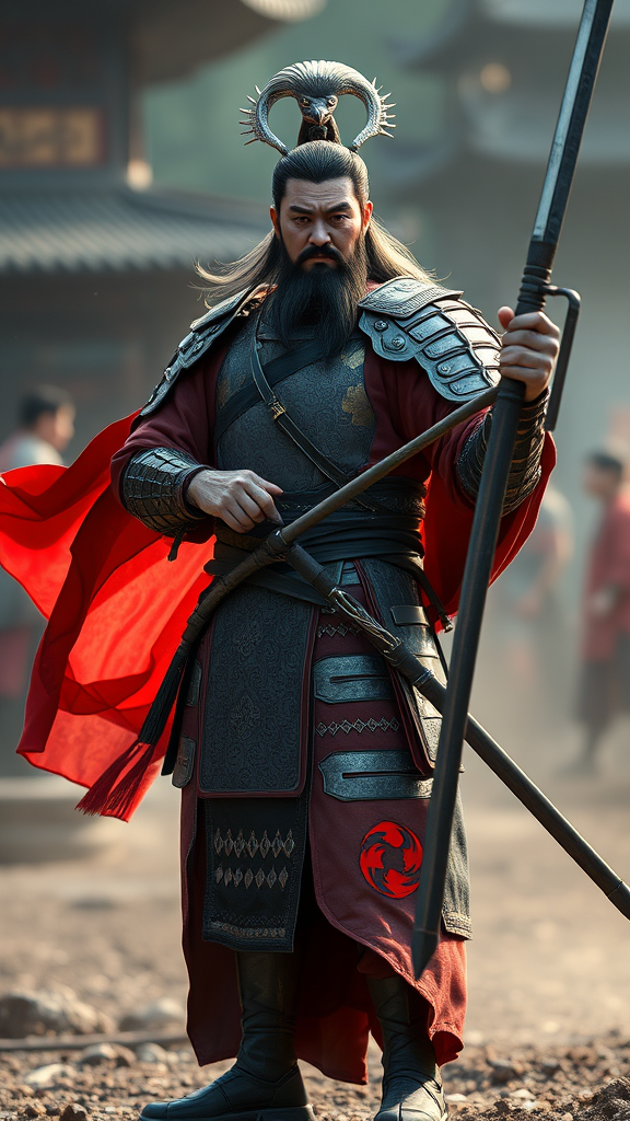 Cinematic action still shot of a Chinese general from the Three Kingdoms period, Guan Yu, a legendary Chinese military figure, is portrayed as a male, middle-aged warrior. He stands in a commanding full-body pose, exuding strength and authority. His attire is a magnificent display of intricate armor, complemented by his distinct phoenix eyes and a flowing, long beard. He grips an imposing weapon, embodying both grace and power. Rendered as a highly detailed 3D model, the scene is captured in photorealistic clarity using Unreal Engine, evocative of an epic video game setting. The shot, reminiscent of a masterpiece captured on a DSLR camera, avoids common rendering issues such as bad anatomy and poor quality, focusing instead on achieving sharpness and vivid colors, maintaining an atmosphere of historical grandeur.