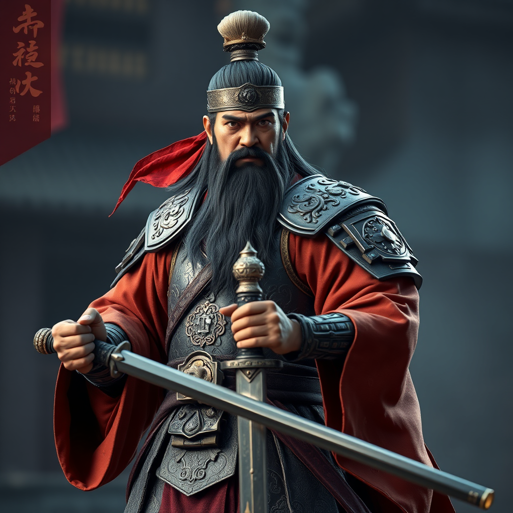 Cinematic action still shot of a Chinese general from the Three Kingdoms period, inspired by Guan Yu, a legendary military figure. The male, middle-aged character stands in a powerful full-body pose, exuding strength. He is clad in exquisite and ornate armor, with unmistakable phoenix eyes and a long, flowing beard. The general firmly grips a traditional weapon, depicted as a highly detailed 3D model, showcasing a photorealistic rendering. This image resembles a high-quality video game scene created using advanced graphics engines. The photo is envisioned as a beautiful, DSLR-captured masterpiece, creatively edited to maintain a dynamic and vivid aesthetic while avoiding common rendering flaws such as imperfect anatomy, missing or extra digits, and poor image quality issues like blurriness and compression artifacts.
