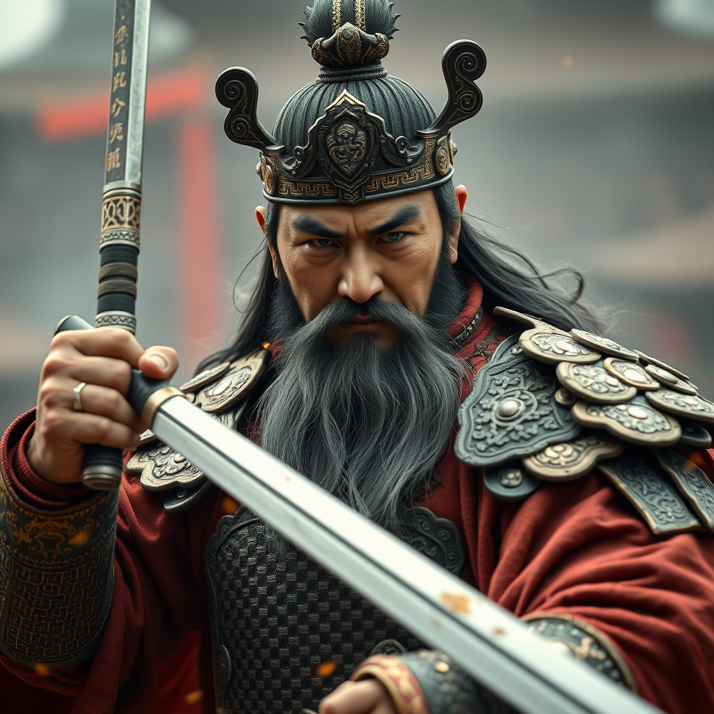 Cinematic action still shot of a dynamic scene featuring Guan Yu, the renowned Chinese military general from the Three Kingdoms period. He is a middle-aged male exuding strength and authority, fully armored in exquisite, intricate battle attire. Guan Yu's piercing phoenix eyes and long, flowing beard contribute to his distinguished appearance. In one hand, he wields a formidable weapon, displaying a commanding presence. The setting is reminiscent of a high-quality 3D model crafted in a photorealistic style, akin to visual aesthetics achieved in Unreal Engine video games. This vivid imagery evokes the artistry of a masterpiece, captured as if shot on a DSLR to ensure richness and clarity, devoid of imperfections such as blurry details, anatomy errors, or low-quality renderings.