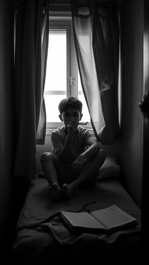 Cinematic black and white, a young Asian boy with a thoughtful expression sits on the edge of a narrow bed, a slender cigarette resting between his fingers, smoke curling gracefully upwards. The small, cramped room is dimly lit, with faint beams of light filtering in through the half-open window, casting soft, moody shadows. The curtains billow gently with a slight breeze, partially obscuring the glow from outside, creating an atmosphere of quiet introspection. A worn-out notebook lies beside him, hinting at untold stories and dreams.
