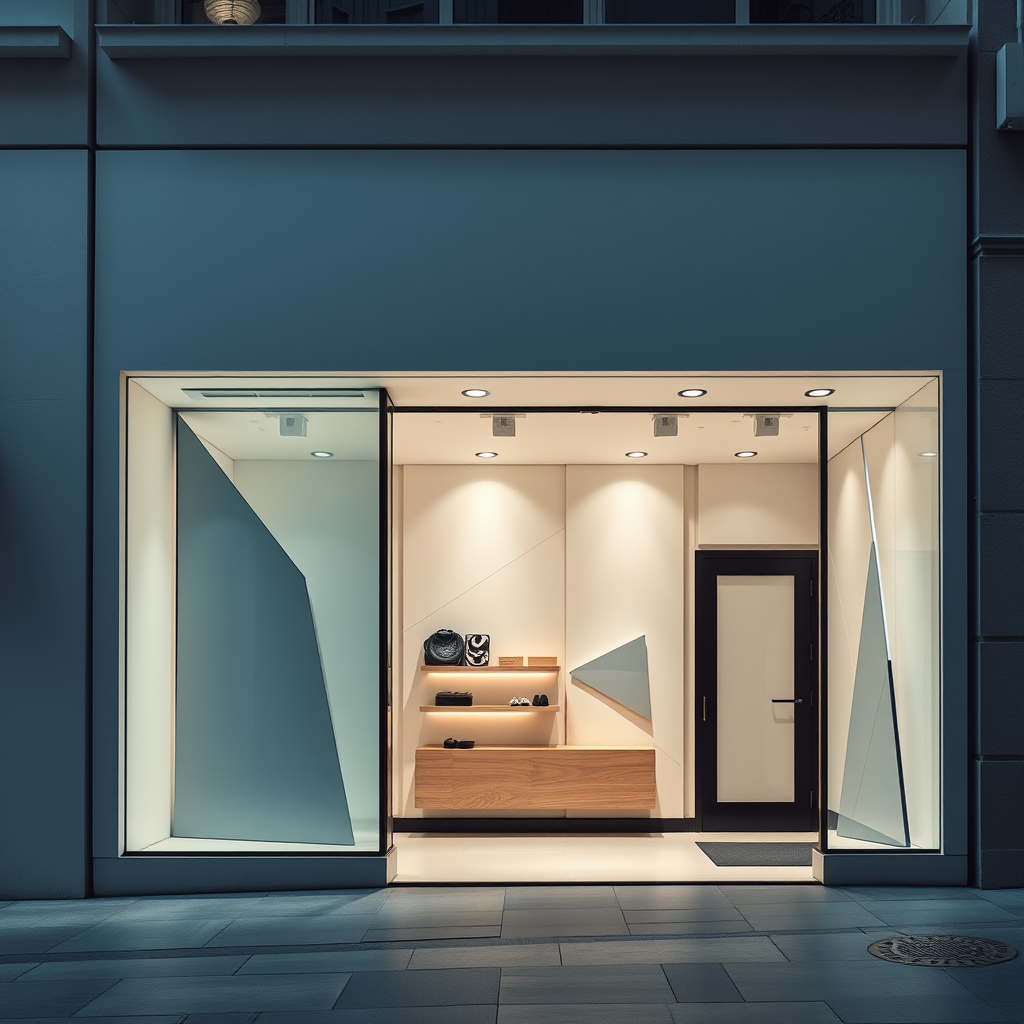 Cinematic capture of a minimalistic retail shop facade with the precision of a Canon EOS 5D, featuring monochromatic walls adorned with geometric shapes, subtly enhanced to evoke modern elegance and sleek sophistication.