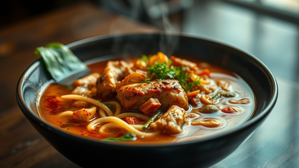 Cinematic close-up of a Teriyaki Chicken Noodle Soup in a deep plate, showcasing its exquisite beauty with high definition clarity and a stunning bokeh effect. The soup is masterfully presented in vibrant colors, accentuating the rich textures and flavors with cinematic lighting. The setting evokes elegance, focusing on the intricacy of the dish as the central masterpiece, with a subtly blurred background to enhance the overall visual appeal and depth.