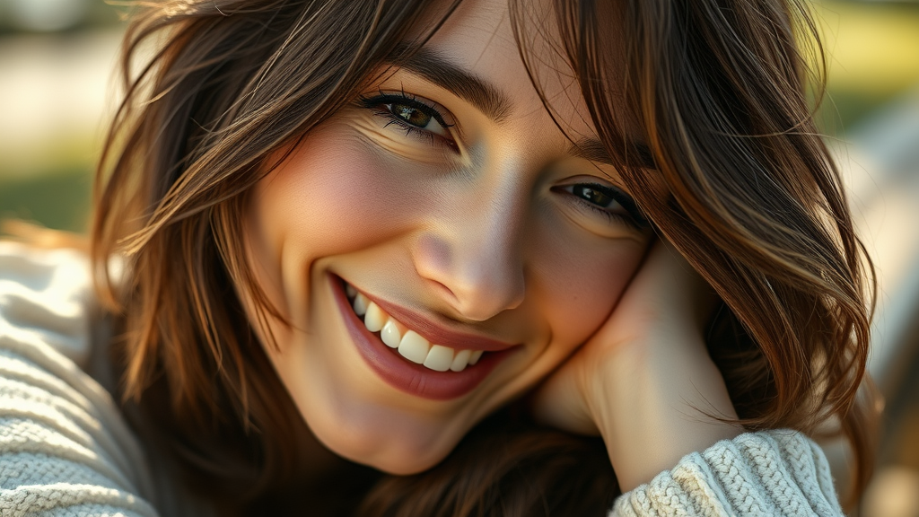 Cinematic close-up photograph of a woman with tousled brunette hair, resting her head on her hand. Her face is free of makeup, exuding a natural, joyful smile in an outdoor setting. The image is a masterpiece captured in UHD, with natural light highlighting her features. The composition is reminiscent of a classic 35mm film photograph, featuring a bokeh effect for a professional touch. The piece is highly detailed and realistic, with elements of a fine drawing: hints of crayon, sketch, and graphite giving it an impressionistic vibe. It embraces subtle noise and softness, capturing the authenticity of the moment. The image is in vibrant color, without distractions, conveying the serene beauty of a happy, natural expression.