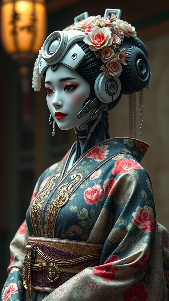 Cinematic depiction of a geisha android adorned with robotic elements, dressed in an ornate floral kimono with intricate details, rendered in 8k resolution.