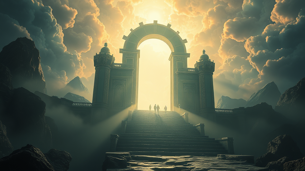 Cinematic depiction of the celestial gates, rendered in exquisite detail, 8k resolution, showcasing an ethereal and atmospheric scene. Influences of Ivan Aivazovsky, Peter Mohrbacher, and Greg Rutkowski are evident, with volumetric light creating a breathtaking spectacle. Broad illumination casts a serene glow across a composition reminiscent of an oil painting, blending fantasy art and sci-fi elements with a touch of realism. This vision is ideal for premium prints and echoes the capabilities of unreal engine, transporting the viewer to a sublime and otherworldly realm.