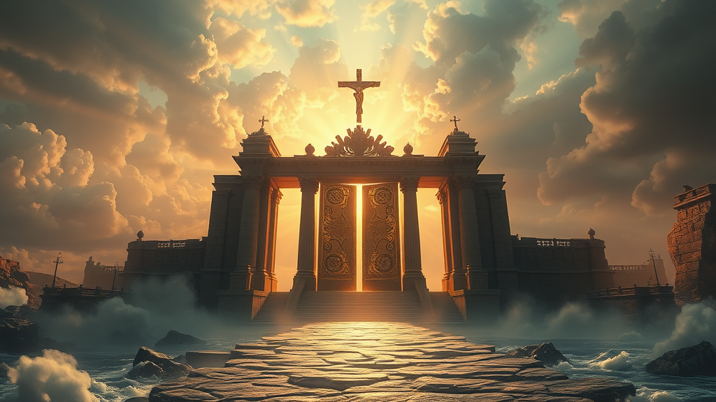 Cinematic depiction of the heavenly gates, richly detailed, 8k realism, atmospheric and awe-inspiring, styled in the manner of Ivan Aivazovsky, Peter Mohrbacher, and Greg Rutkowski. Bathed in volumetric light effects and broad illumination, this scene combines the texture of oil painting with fantasy art elements, blending sci-fi and realism. Designed for premium prints with an unreal engine touch, offering a mystical, ethereal experience.