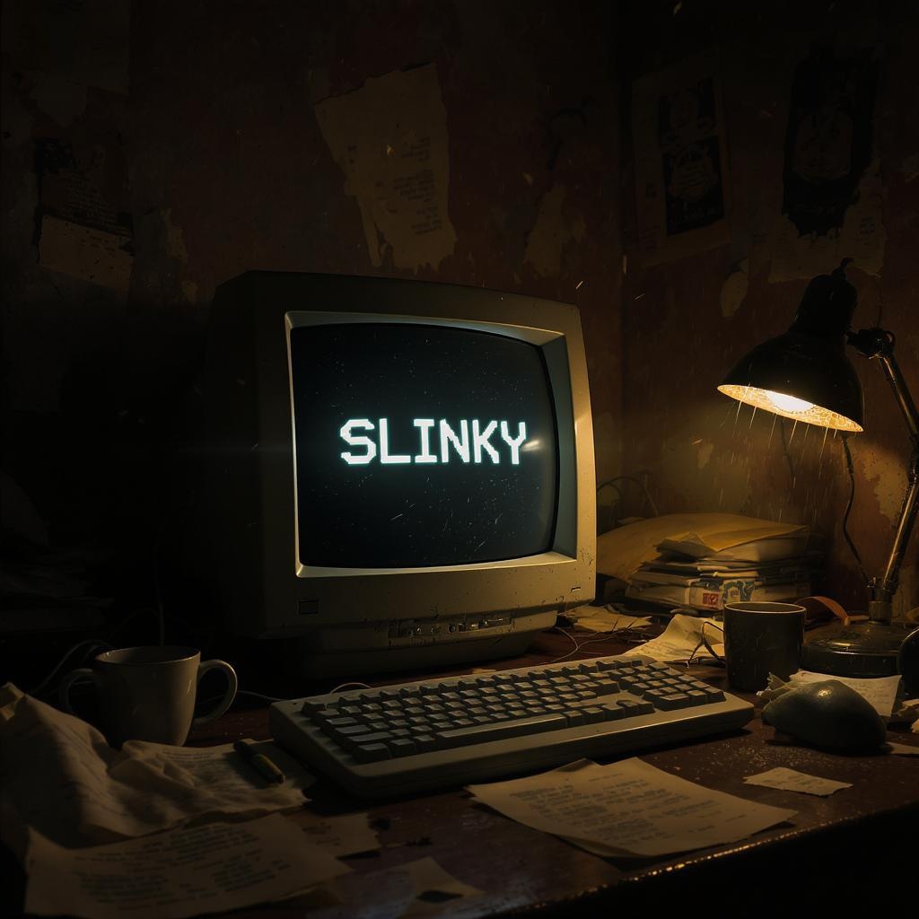 Cinematic detailed render of an aged, dusty CRT monitor sitting on a cluttered wooden desk in a dimly-lit, messy room. The screen displays the word "SLINKY" softly glowing against the darkened ambiance. The surrounding desk is scattered with vintage items, such as yellowing papers, an old coffee mug, and a tarnished desk lamp with a cracked shade casting a warm glow. Dust particles float gently in the air, catching stray beams of light. The walls are adorned with faded, peeling wallpaper and a tattered poster. A narrow depth of field highlights the intricate textures of the CRT, emphasizing its worn exterior and the nostalgic, chaotic atmosphere of the room.