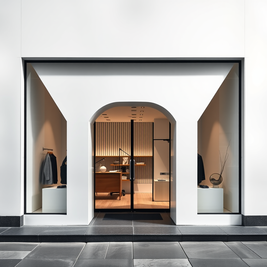 Cinematic elegance captured through the lens of a Canon EOS 5D, a minimalistic retail shop facade emerges with monochromatic walls adorned in geometric patterns, exuding a refined yet modern aesthetic with subtle creative touches.