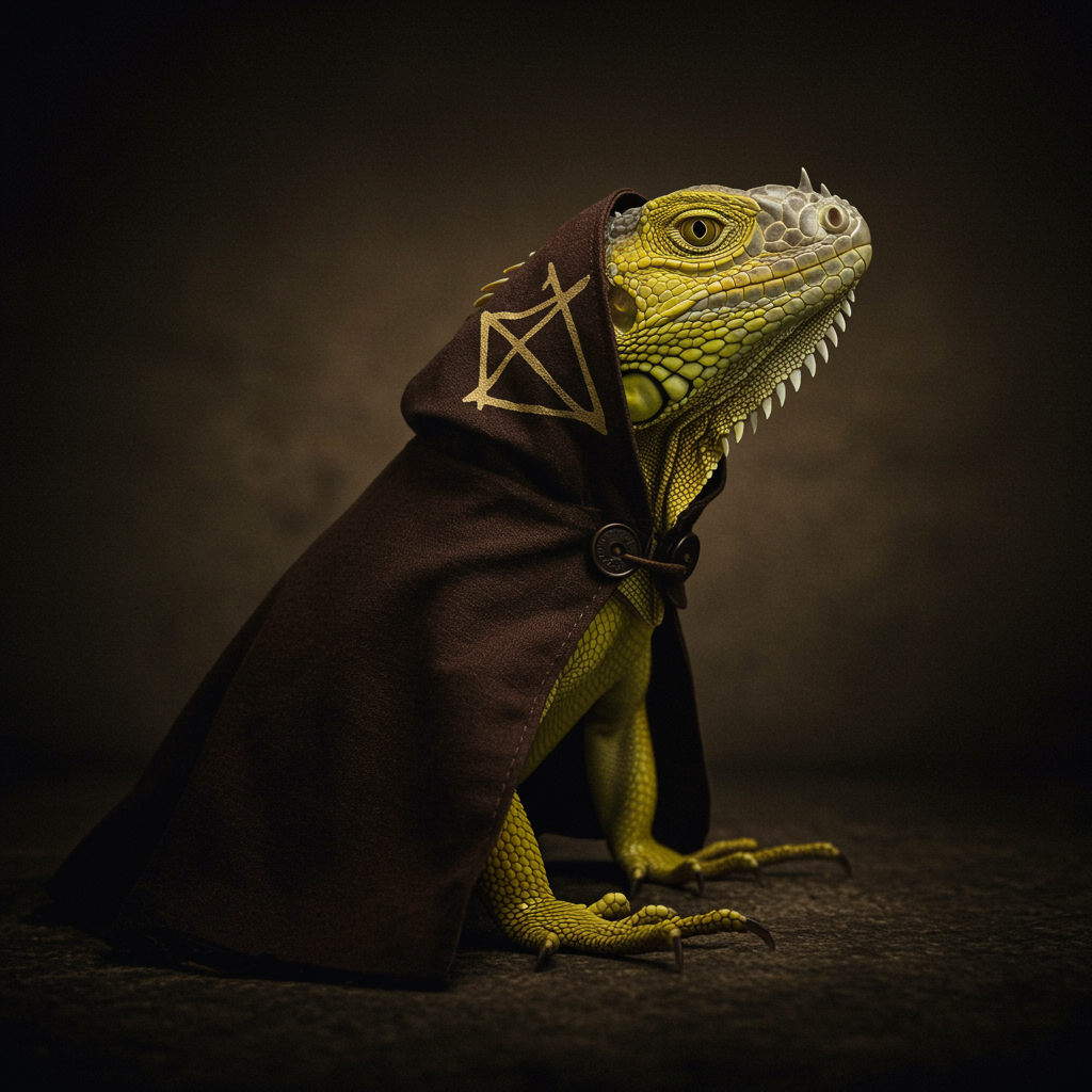 Cinematic film still award-winning photograph of a charming yellow iguana draped in a mystical cultist cloak, against a backdrop of rustic tones, full body. Featuring a shallow depth of field and a subtle vignette, highly detailed with a luxurious, high-budget feel. Enveloped in beautiful bokeh, the composition captures a cinemascope essence—moody and epic with a captivating, gorgeous quality. The image is enhanced by film grain, giving it a textured, grainy yet refined appearance.