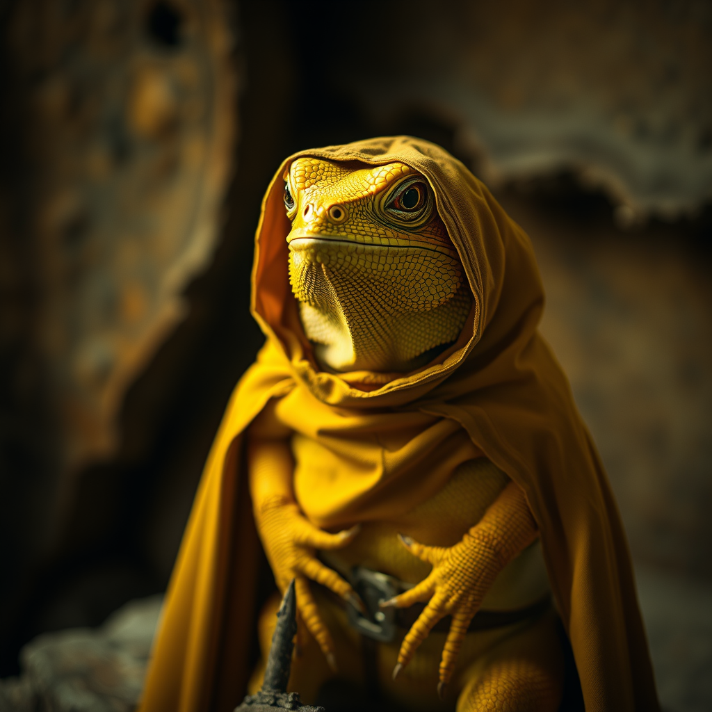 Cinematic film still capturing an adorable yellow iguana draped in a mysterious cultist cloak, set against a backdrop of rustic textures. The composition is an epic full-body portrait with a shallow depth of field that highlights intricate details. Enclosed in a subtle vignette, the scene feels like a high-budget production with exquisite bokeh effects. The cinemascope aspect ratio enhances its moody, breathtaking aesthetic, enriched by a touch of film grain for a vintage, grainy allure.