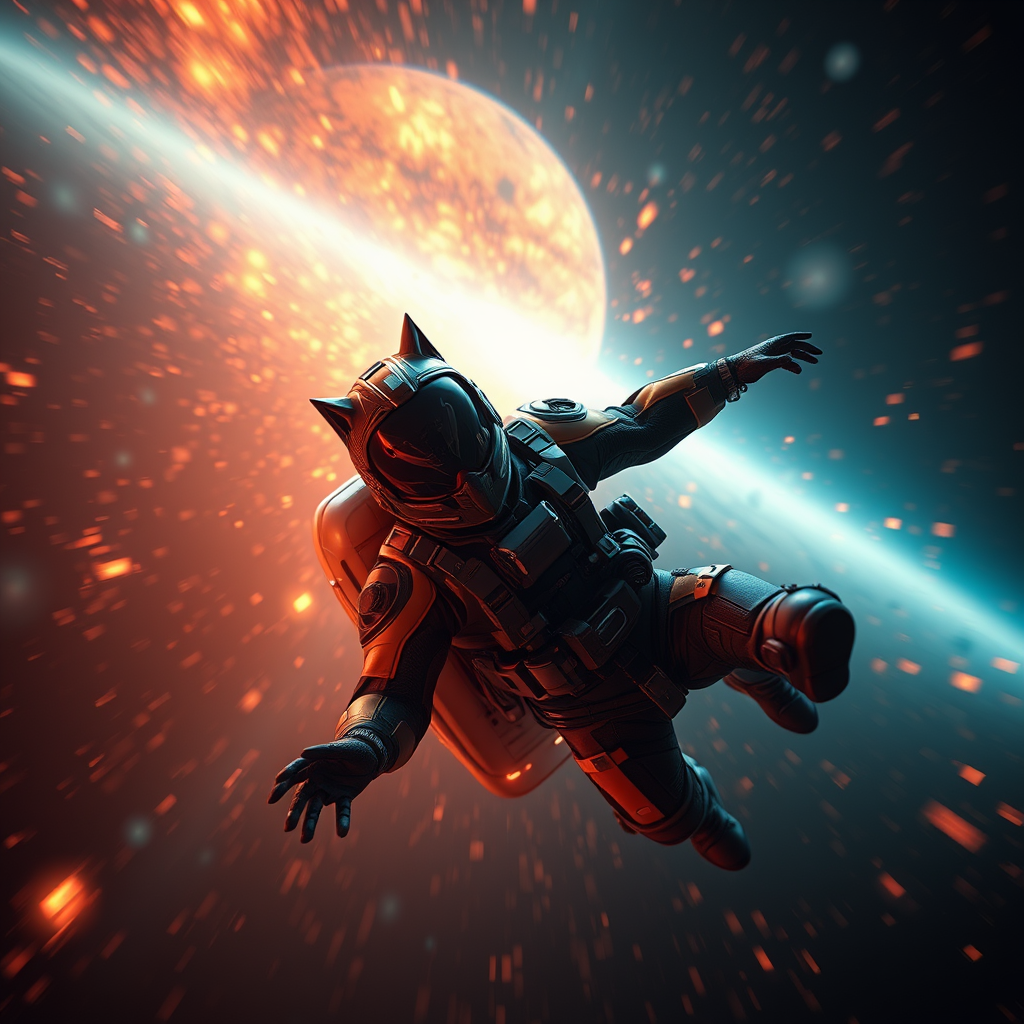 Cinematic film still featuring a highly detailed professional 3D model, inspired by anime concept art, creating a masterpiece oil painting feel. The scene depicts a futuristic pilot in a cutting-edge sci-fi space suit, tumbling backwards into the vast cosmos. The suit reflects a surreal, ethereal, and mysterious design, with a fantasy allure, characterized by an exaggeratedly detailed, psychedelic vibrancy. The digital artwork is illustrative and painterly, resembling a matte painting with volumetric, dramatic lighting that bathes the scene in an otherworldly glow. The pilot's panic and fear are palpable as he navigates the cosmos in his black and fire orange suit, adorned with an aggressively wolf-designed helmet and shiny surfaces suggestive of a reactor core. Cosmic fire frames the figure, with a shallow depth of field and a soft vignette adding to the highly detailed, high-budget feel. Bokeh effects, cinemascope framing, and a moody, epic atmosphere enhance the cinematic quality, while film grain adds a gritty, immersive texture.