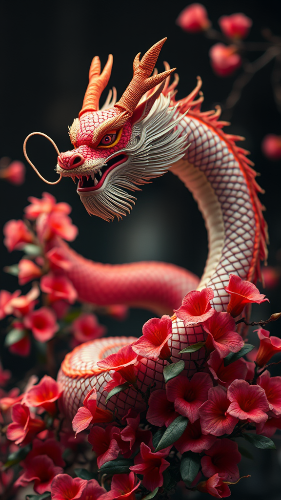Cinematic film still of a Chinese dragon intertwined with vibrant flowers, featuring a sinuous, snake-like body that curls gracefully, exhibiting a mesmerizing display. The dragon's skin boasts intricate scales, adorned in stunning colors, and crowned with regal horns. This depiction embodies the traditional Chinese aesthetic, capturing the essence of a mythical creature. The shallow depth of field enhances the scene, wrapped in a vignette, with exquisite detail reminiscent of a high-budget production. The atmosphere is moody and epic, enriched by gorgeous bokeh and cinemascope framing, blending a film-grain texture with the allure of grainy anime and abstract nuances. The artwork steers clear of imperfections, ensuring high-quality visuals, free from errors, distortions, or inconsistencies, maintaining its sharpness and clarity.