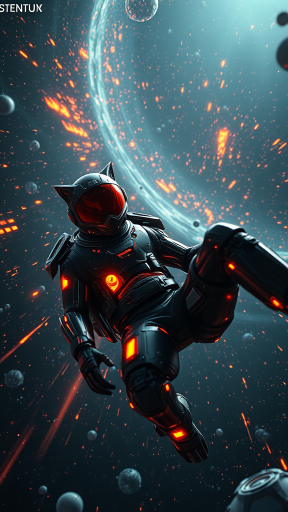 Cinematic film still of a professional 3D model anime artwork; a masterpiece oil painting, comic Dreamscape featuring a futuristic pilot in a sleek, sci-fi inspired space suit tumbling backwards into a vast cosmos. The suit, reminiscent of a high-tech anime series, is intricate and highly detailed, blending surreal and ethereal qualities with a touch of dreamy fantasy. Vibrantly psychedelic, the artwork is digital and illustrative, echoing the depth of a painterly matte painting. The pilot, caught in a moment of panic and fear, is the key visual of this vibrant and complex scene. Rendered with octane precision, the scene is rich with volumetric, dramatic lighting, accentuating a glossy surface. Lens flare reflects off the shiny armor, powered by a glowing reactor core, with a fierce color scheme of black and fire orange. The aggressively designed wolf helmet adds an edge, bathed in cosmic flames. A shallow depth of field focuses on the pilot, framed with a moody vignette and high-budget bokeh. The scene unfolds with an epic, gorgeous cinemascope quality, enhanced by a subtle film grain that adds a touch of nostalgia to this futuristic, grainy masterpiece.