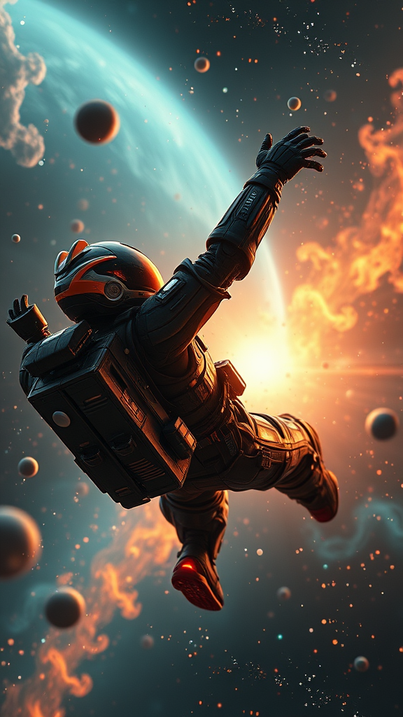 Cinematic film still professional 3D model anime artwork concept art a masterpiece oil painting, comic Dreamscape of a futuristic pilot in a sleek suit tumbling backwards into the cosmos, the space suit reminiscent of a science fiction anime. Surreal, ethereal, dreamy, mysterious, fantasy, intricately detailed with psychedelic and vibrant colors. Digital artwork, illustrative, painterly, matte painting, deeply detailed, showing him in a state of panic and fear. Key visual, vibrant, with exquisite detail. Octane render, showcasing volumetric, dramatic lighting with a glossy finish, lens flare, and reflective surfaces. The suit features a reactor core, heavy armor in a striking black and fire orange color scheme, an aggressively wolf-themed helmet, and cosmic fire elements. With a shallow depth of field, vignette effect, high-end detailing, bokeh effects, cinemascope proportions, and a moody, epic atmosphere, the image appears with film grain for a grainy, high-budget cinematic experience.