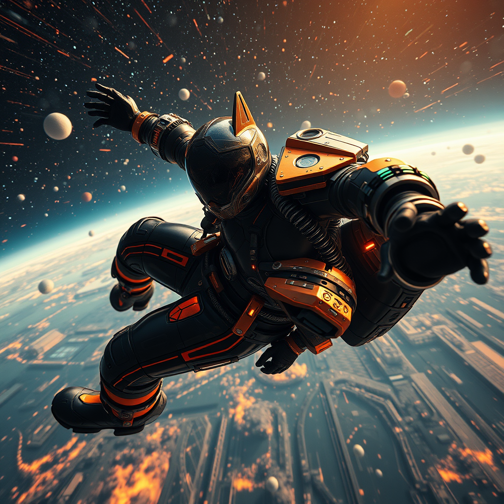 Cinematic film still professional 3D model anime artwork concept art a masterpiece oil painting, comic comic Dreamscape featuring a futuristic pilot in a cutting-edge suit tumbling backwards into the vast cosmos. The space suit, reminiscent of a science fiction anime, is surreal, ethereal, and dreamy, steeped in mystery and fantasy. The design is highly detailed and psychedelic, vibrant and illustrative, with a painterly quality akin to a matte painting. The pilot appears panicked, frightened, as a key visual unfolds around him with vibrancy and intricate detail. Rendered in octane, the scene boasts volumetric, dramatic lighting that highlights the glossy, shiny surface of the suit adorned with a powerful, wolf-inspired helmet. The color scheme is a striking mix of black and fiery orange, as though the cosmos itself is on fire. Elements of a reactor core and heavy armor are visible, depicted with shallow depth of field and a subtle vignette for an artistic touch. The high-budget aesthetic is enhanced by bokeh, cinemascope effects, creating a moody, epic, and visually stunning tableau with film grain enhancing its cinematic quality.