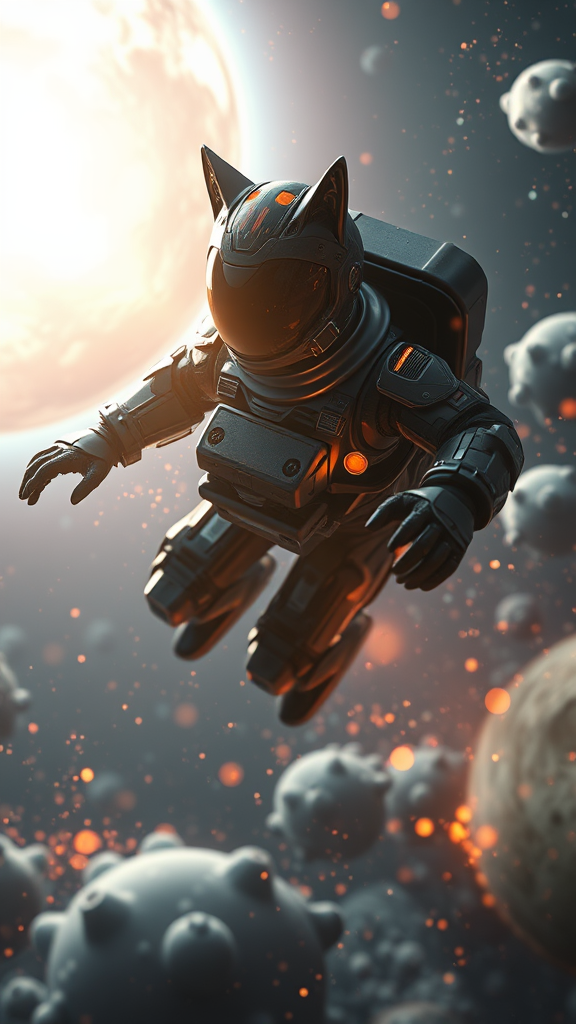 Cinematic film still professional 3D model anime artwork concept art masterpiece oil painting comic Dreamscape futuristic pilot suit tumbling into the cosmos, the space suit reminiscent of a science fiction anime. Surreal, ethereal, dreamy, mysterious, fantasy, exquisitely detailed, psychedelic, vibrant. Digital artwork, illustrative, painterly, matte painting, intricately detailed, he is anxious, frightened. Key visual, vibrant, elaborately detailed. Octane render, sharply detailed, volumetric, dramatic lighting, glossy with lens flare, shiny surface, reactor core, robust armor, black and fiery orange color scheme, ferociously wolf-themed helmet, on cosmic blaze. Shallow depth of field, vignette, intricately detailed, blockbuster quality, bokeh, cinemascope, moody, epic, stunning, film grain, textured.