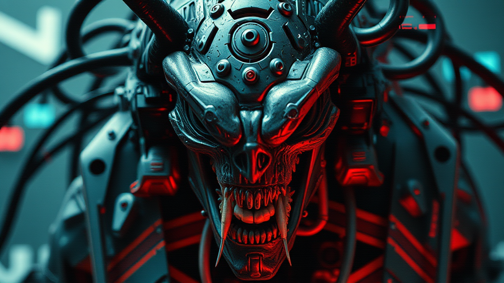Cinematic film still showcasing an ultra-detailed and realistic depiction of a cyber predator in the year 2099, featuring highly intricate details. The image presents a complex and visually striking portrayal, capturing elements of distortion and abstraction with a noisy, grainy texture. It conveys the chaotic essence through a blend of deformed and mutated features, resembling a surreal and impressionistic style. The creative use of glitch effects and an oversaturated color palette adds to its otherworldly appearance, while subtle nods to anime and cartoon aesthetics provide a unique, artistic flair. The result is a sophisticated yet unsettling masterpiece with a vivid and imaginative vision of a futuristic, disfigured entity.