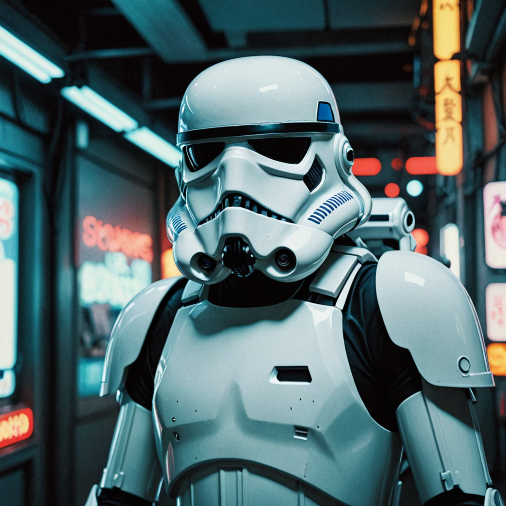 cinematic film still, Storm Trooper, colored lights, amazing quality, wallpaper, analog film grain <lora:aesthetic_anime_v1s:0.5> <lora:add-detail-xl:1.1>