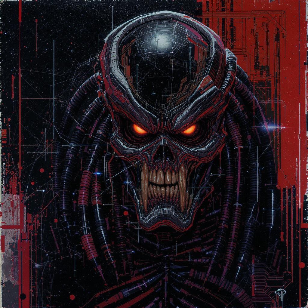Cinematic film still ultra detailed realistic picture intricate details cyber predator 2099 ugly deformed distorted grainy drawing sketch graphite impressionist soft anime cartoon graphic painting abstract glitch disfigured low contrast oversaturated blurred noisy mutated underexposed overexposed flat disfigured noisy distorted peculiar futuristic creature complex shadows science fiction environment dark edgy modern textures vibrant color palette high-tech elements imaginative avant-garde aesthetics.