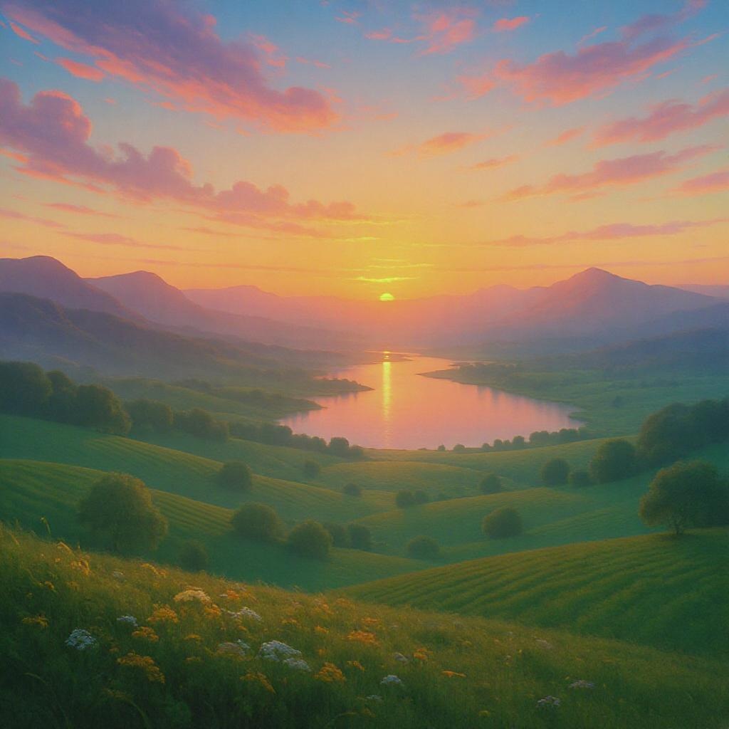 Cinematic landscape, vivid colors, sweeping horizons, tranquil sunset, gentle breeze, golden hour glow, expansive fields, serene lake, distant mountains, silhouetted trees, mesmerizing reflections, pastel sky, ethereal atmosphere, infinite perspective, dreamlike scene.