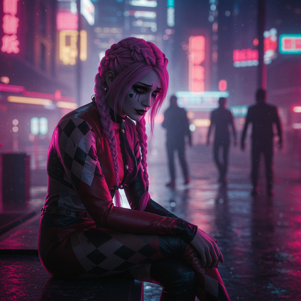 Cinematic lighting, 4k resolution, ultra-detailed, hyper-realistic portrait of a melancholy woman dressed as a harlequin, featuring dramatic heavy eyeliner. Set against the vibrant backdrop of a bustling cyberpunk cityscape, the woman, with luminous pink hair styled in intricate braids, sits pensively on a bench. The city is alive with neon lights reflecting on the wet pavement, casting a colorful glow on her reflective expression. People, mere silhouettes, move swiftly in the background, adding a dynamic contrast to the stillness of the woman's somber presence, set in a 9:16 aspect ratio.