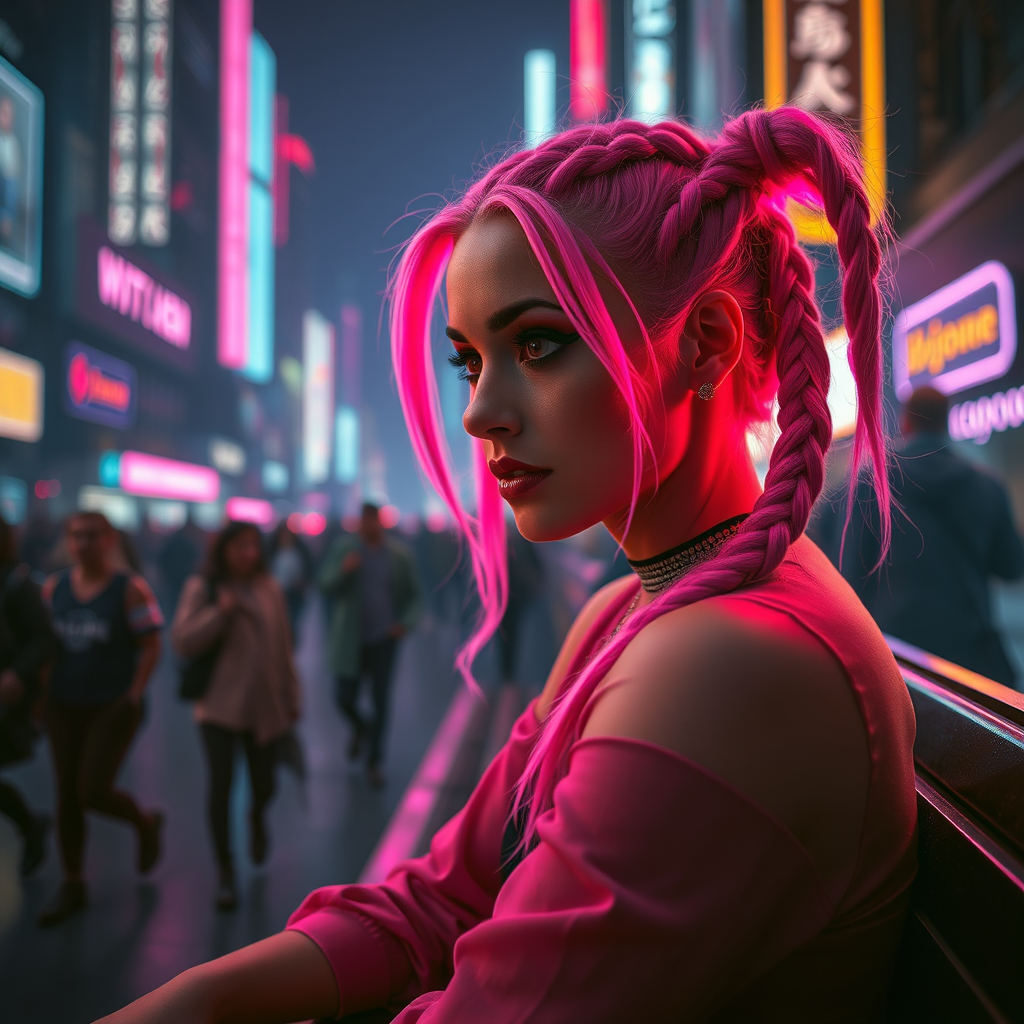 Cinematic lighting, 4k, ultra details, ultra realism, a melancholic woman dressed as a harlequin with heavy eyeliner, set against a cyberpunk cityscape. Her braided hair glows with vibrant pink hues, casting an ethereal glow around her as she sits thoughtfully on a bench. In the background, a bustling crowd of people moves in different directions, their neon-lit silhouettes adding depth to the scene. The atmosphere is a blend of futuristic and vintage elements, evoking a sense of both nostalgia and modernity as the woman's expression captures the essence of solitude.