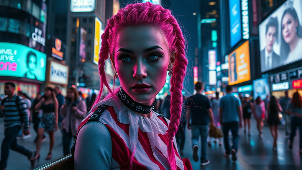 Cinematic lighting, 4k, ultra details, ultra realism, a melancholic woman in harlequin attire with dramatic eyeliner, set in a cyberpunk cityscape. Her luminous pink hair, intricately braided, catches the neon reflections of the bustling metropolis as she sits on a bench. Behind her, a diverse crowd meanders, their silhouettes blurred against the vibrant holographic advertisements and towering skyscrapers. The atmosphere is one of dynamic contrast, vibrant yet somber, capturing the woman's introspection amidst the city's electric pulse. Aspect ratio 9:16.