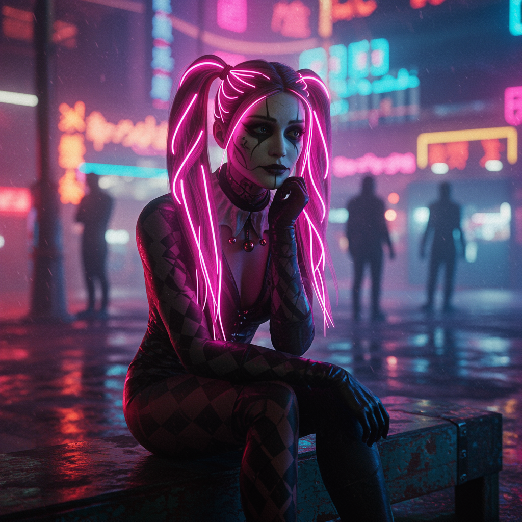 Cinematic lighting, 4k, ultra details, ultra realism, melancholic woman dressed as a harlequin with intricate face paint, thick black eye liner, set against the vibrant backdrop of a neon-lit cyberpunk city. Her hair, an ethereal cascade of glowing pink braids, shines vividly, matching the neon signs flickering around. Seated on an aged bench, her contemplative expression contrasts sharply with the bustling crowd of shadowy figures drifting in the background, immersed in their own realities. The scene captures the juxtaposition of solitude amidst the ceaseless energy of the city, with reflections of colorful lights dancing across rain-slicked streets.