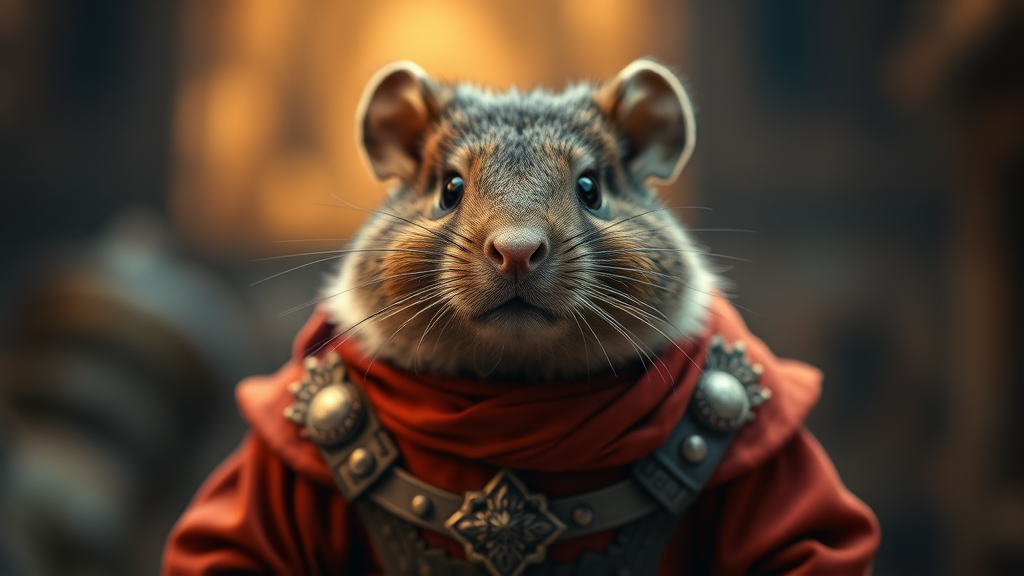 Cinematic masterpiece still of an award-winning character portrait featuring an adorable, stocky, and slightly aloof brown mole adorned in regal medieval attire, enhanced with a rich rust palette. The scene captures a full-body view with a shallow depth of field and a subtle vignette, showcasing intricate details typical of high-budget productions. Soft bokeh envelops the frame, blending cinemascope grandeur with a moody and epic aura. The enchanting composition is embellished with a touch of film grain, adding a timeless and artistic texture to the shot.