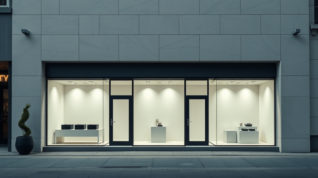 Cinematic minimalist retail shop facade design featuring a monochromatic geometric exterior captured with a Canon EOS 5D, incorporating subtle texture variations and clean lines to enhance visual impact.