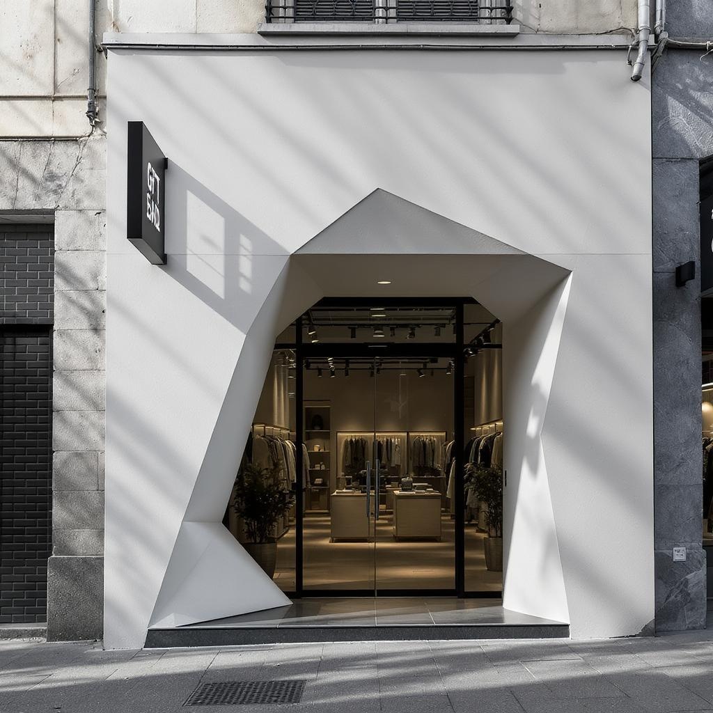 Cinematic minimalistic retail shop facade design with a geometrically shaped entrance, captured through a Canon EOS 5D lens; adorned in a sleek monochromatic palette, the walls complement the sharp lines and clean angles, creating a modern yet inviting atmosphere.