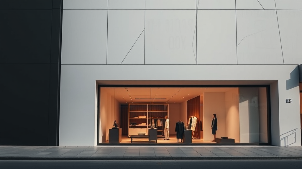 Cinematic minimalistic retail shop facade with a sleek geometric design and monochromatic color palette, as captured through the lens of a Canon EOS 5D, offering a modern and artistic visual appeal.