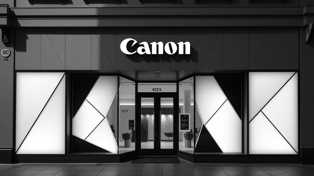 Cinematic monochromatic retail shop facade design inspired by Canon EOS 5D, featuring minimalistic geometric shapes on facade walls, incorporating subtle creative modifications to enhance visual appeal.
