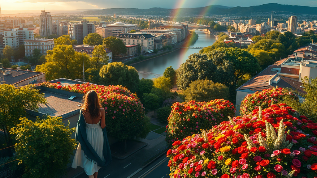 Cinematic oil painting, aerial city view; streets teeming with vibrant flowers; women in ethereal white dresses appear in the distance. The landscape blends urban charm with abundant floral hues, kissed by sun rays on a joyous day. A rainbow arches over lush trees, with a serene river weaving through nature's marvel. The scene channels the aesthetics of deviantart, featuring cinematic lighting and a supermodel's gaze, captured in exquisite detail. Photorealistic imagery portrays an editorial touch, complemented by 70mm lens precision and profound depth of field. With tilt blur at shutter speed 1/1000 and F/22, colors dance in ProPhoto RGB. Super-resolution and VR bring life to the image's vastness, bathed in half-rear natural and incandescent light. The mood is set through cinematic illumination, blending studio, volumetric, and contre-jour techniques. Light plays with shadow, utilizing global illumination and ray tracing, enhanced by reflections, glow, and scattering. Chromatic nuances and diffraction create a dynamic visual, while advanced techniques like ambient occlusion, antialiasing, and shaders craft the final masterpiece, capturing elegance in the model's dynamic pose. A photographic marvel in 8k UHD HDR glory.