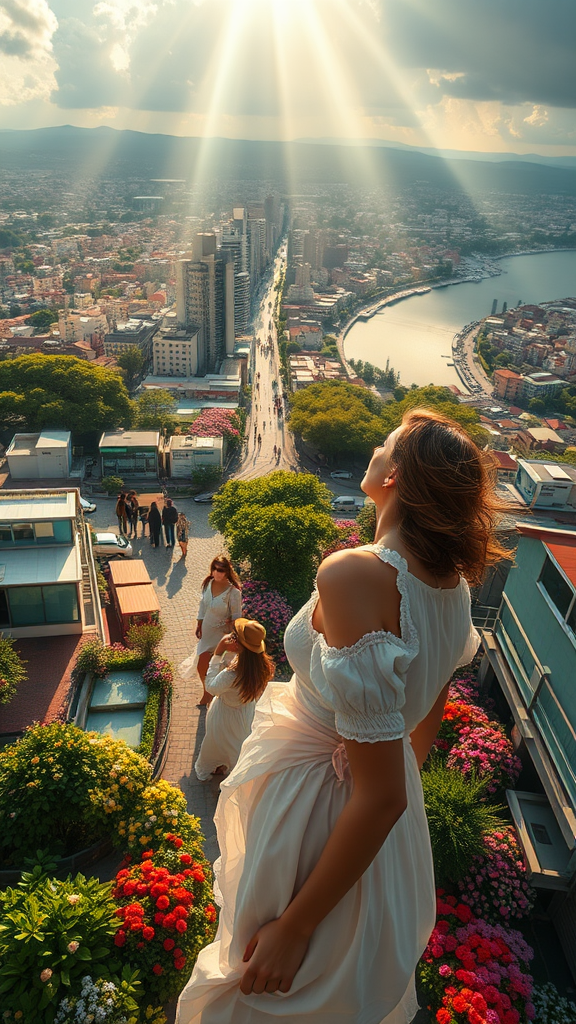Cinematic, oil painting, aerial view, vibrant cityscape, blooming streets, women in white dresses at a distance, stunning landscape, abundant flowers, vivid colors, sun rays piercing through, joyous day, rainbow arching over, lush trees, serene river, harmonious blend of nature, deviantart-inspired, cinematic brilliance, striking Supermodel Woman, intricate fine detail, ultra-realistic, cinematic framing, photorealistic portraiture, expertly color graded, editorial flair, still life photography, captured with a 70mm lens, subtle depth of field, stylish tilt blur, swift shutter speed 1/1000, precise F/22, balanced white tones, remarkable 32k clarity, high resolution, ProPhoto RGB, immersive VR touch, solitary yet uplifting, grand scale, half-rear glow, ethereal backlight, natural illumination, warm incandescent hue, fiber optic mood lighting, cinematic and studio light fusion, soft and volumetric glow, striking contre-jour, captivating accent highlights, comprehensive global illumination, advanced ray tracing realism, optical intricacies, luminous scattering, delicate shadows, subtle roughness, mesmerizing flicker, refined ray traced reflections, dynamic Lumen effects, intricate screen space reflections, diffraction artistry, minor chromatic divergence, nostalgic scan lines, atmospheric ambient occlusion, impeccable antialiasing, FKAA and TXAA techniques, RTX enhancements, SSAO precision, sophisticated shaders, cutting-edge OpenGL and GLSL creativity, thorough postprocessing, expressive cel shading, nuanced tone mapping, CGI finesse, compelling VFX, impactful SFX, graceful dynamic stance, high-definition photography, 8k quality, UHD texture, HDR richness, high caliber --ar 2:3.