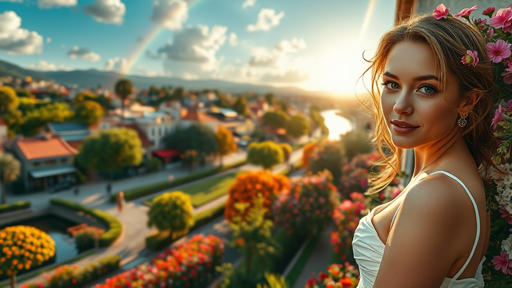 Cinematic oil painting cityscape captured from a drone, showcasing vibrant streets adorned with a multitude of flowers. In the distance, women in elegant white dresses add a touch of grace against a stunning landscape. The scene is bursting with colors, as sun rays filter through trees, casting a gentle glow across a river that meanders through the heart of nature. A radiant rainbow arches overhead, enhancing the exuberance of the day. The composition evokes the essence of deviantart with its cinematic lighting and intricate detailing. A beautiful supermodel strikes a refined pose, her features rendered in ultra-realistic, photorealistic detail, emanating a captivating aura. Editorial photography echoes through the scene, captured with a precise 70mm lens, depth of field, and a tilt blur effect. Advanced optics and cinematic lighting techniques such as ray tracing, volumetric lighting, global illumination, and lens reflections create mesmerizing visual dynamics. Shadows and soft incandescent lighting blend seamlessly with the natural surroundings. The interplay of elegant light and shadow brings depth and texture, enhanced by postprocessing, shaders, and ambient occlusion. Photographic artistry meets cutting-edge technology, resulting in an awe-inspiring visual narrative that blends elegance with dynamic storytelling, captured in stunning 8k UHD HDR quality.