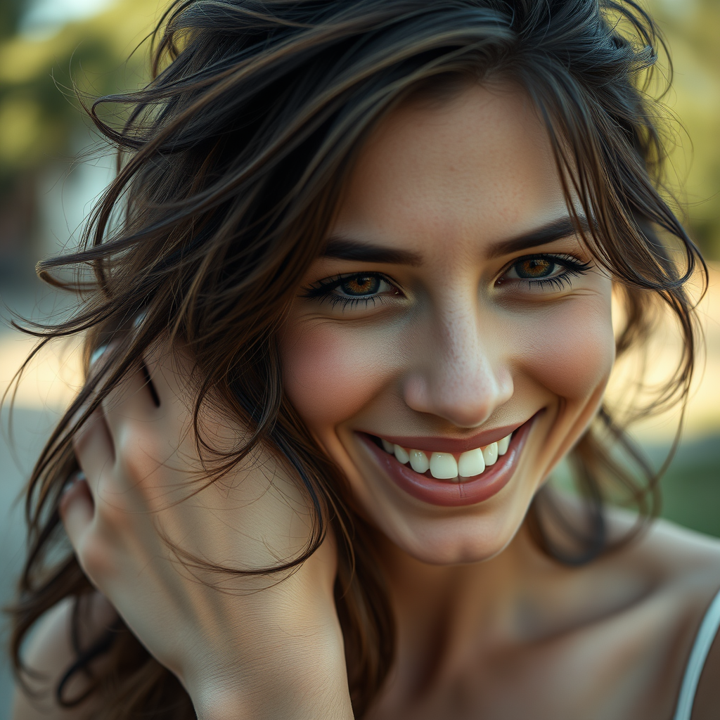 Cinematic photo, extreme close-up, a woman with tousled brunette hair gently resting her head on her hand, barefaced and joyful, smiling naturally in an outdoor setting, a true masterpiece captured in UHD. Shot on 35mm film with a rich bokeh effect, exuding professionalism with 4k realistic details, reminiscent of a highly detailed drawing or painting. Elements of crayon, sketch, and graphite blend with an impressionist touch, softly blurred in parts for artistic effect, with imperfections that add character.