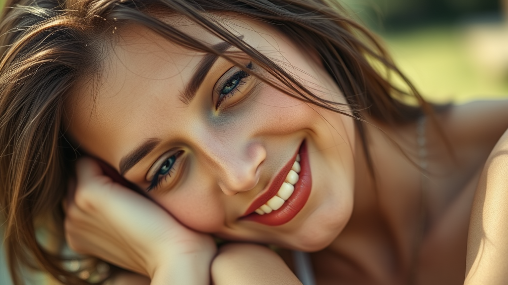 Cinematic photo extreme close-up of a woman with tousled brunette hair resting her head on her hand, bare-faced, content, and smiling outdoors. This masterpiece captures her in natural light with a realistic touch akin to a 35mm film photograph. The scene features a lovely bokeh effect with professional 4k detail, rendered as a highly detailed drawing that feels like a blend of impressionist painting, crayon sketch, and graphite artistry. The atmosphere is serene yet dynamic, focusing on genuine emotion rather than perfection, with a touch of creative softness adding to its charm.
