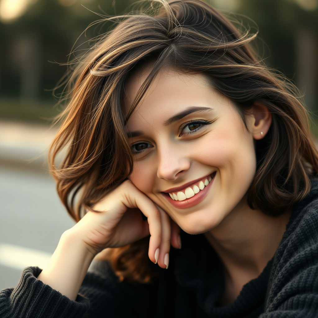Cinematic photograph of a woman with tousled brunette hair resting her head on her hand, exuding natural happiness and a warm smile while outdoors. The image captures natural light beautifully in UHD, resembling a masterpiece with a realistic touch. Shot on 35mm film, it features a professional bokeh effect. The work is highly detailed, evoking elements of a detailed drawing, painting, crayon sketch, and graphite. The impressionist style adds a touch of noise and softness. Despite imperfections, such as blurriness, the monochrome palette conveys depth, with no makeup enhancing her authentic charm.