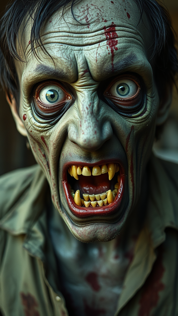 Cinematic portrait of a deranged zombie man with hungry eyes, inspired by George A. Romero's style. The zombie's skin is mottled green with visible stains, his sunken glazed eyes appear unfocused. He wears tattered and bloodstained clothing, evoking a grotesque and unsettling mood with an overall sense of decay. Captured with a 1970's Leica M3, Summicron 35mm lens at f4 aperture, ISO 400, shutter speed 1/125, using 1970s Kodak color film. Horror style essence maintained, with slight creative twists, ensuring quality and composition remain high with no distracting elements.