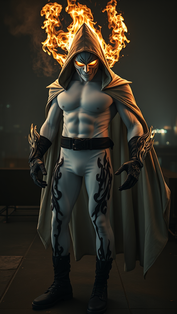 Cinematic portrait of a menacing supernatural vigilante, muscular Caucasian male with imposing athletic build, wearing a ghostly pale spandex bodysuit. Dramatic noir lighting with volumetric fog effects. The costume features intricate obsidian and charcoal flame patterns that organically flow up from dark gray combat boots and gauntlets, creating detailed gothic tendrils that wrap around the thighs and forearms. Wide black tactical belt with polished silver studs catches ambient street light. A flowing short cloak with oversized hood drapes his shoulders, adorned with detailed black and ash-gray flame motifs along the edges and ribbing. Pure white latex mask obscures all facial features except piercing, luminescent golden eyes that emit an ethereal glow within the shadow of the cowl. Hyperrealistic flames emanate from his hands and crown his head with a massive fiery halo, casting dramatic chiaroscuro lighting across the scene. The flames incorporate particles and embers with subtle color variations of orange, blue and white. Dynamic full-body pose on a dark urban rooftop, surrounded by art deco architecture and neon-lit streets below. Moody atmospheric fog and smoke effects add depth. Style of Alex Ross and Greg Capullo, 8k resolution, dramatic rim lighting, volumetric god rays, cinematic color grading