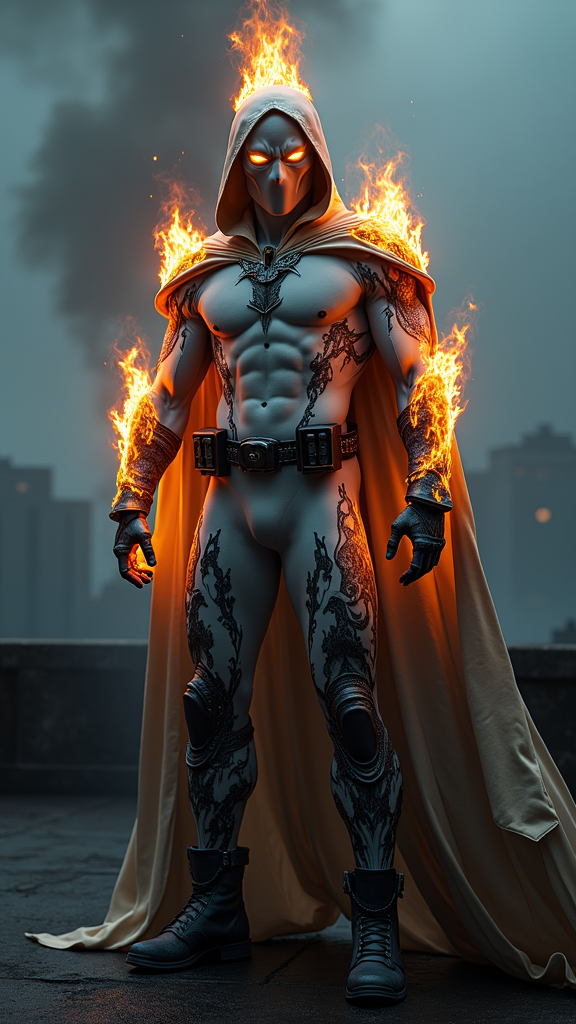 Cinematic portrait of a menacing supernatural vigilante, muscular Caucasian male with imposing athletic build, wearing a ghostly pale spandex bodysuit. Dramatic noir lighting with volumetric fog effects. The costume features intricate obsidian and charcoal flame patterns that organically flow up from dark gray combat boots and gauntlets, creating detailed gothic tendrils that wrap around the thighs and forearms. Wide black tactical belt with polished silver studs catches ambient street light. A flowing short cloak with oversized hood drapes his shoulders, adorned with detailed black and ash-gray flame motifs along the edges and ribbing. Pure white latex mask obscures all facial features except piercing, luminescent golden eyes that emit an ethereal glow within the shadow of the cowl. Hyperrealistic flames emanate from his hands and crown his head with a massive fiery halo, casting dramatic chiaroscuro lighting across the scene. The flames incorporate particles and embers with subtle color variations of orange, blue and white. Dynamic full-body pose on a dark urban rooftop, surrounded by art deco architecture and neon-lit streets below. Moody atmospheric fog and smoke effects add depth. 8k resolution, dramatic rim lighting, volumetric god rays, cinematic color grading