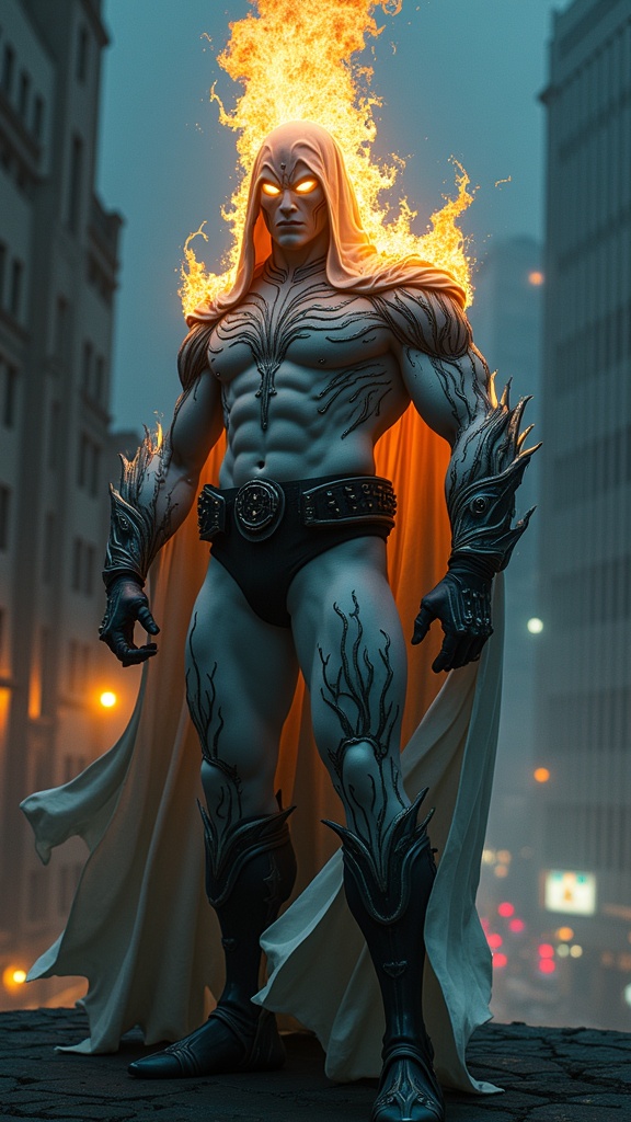 Cinematic portrait of a menacing supernatural vigilante, muscular Caucasian male with imposing athletic build, wearing a ghostly pale spandex bodysuit. Dramatic noir lighting with volumetric fog effects. The costume features intricate obsidian and charcoal flame patterns that organically flow up from dark gray combat boots and gauntlets, creating detailed gothic tendrils that wrap around the thighs and forearms. Wide black tactical belt with polished silver studs catches ambient street light. A flowing short cloak with oversized hood drapes his shoulders, adorned with detailed black and ash-gray flame motifs along the edges and ribbing. Pure white latex mask obscures all facial features except piercing, luminescent golden eyes that emit an ethereal glow within the shadow of the cowl. Hyperrealistic flames emanate from his hands and crown his head with a massive fiery halo, casting dramatic chiaroscuro lighting across the scene. The flames incorporate particles and embers with subtle color variations of orange, blue and white. Dynamic full-body pose on a dark urban rooftop, surrounded by art deco architecture and neon-lit streets below. Moody atmospheric fog and smoke effects add depth. 8k resolution, dramatic rim lighting, volumetric god rays, cinematic color grading