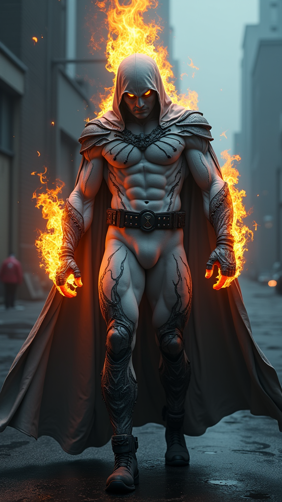 Cinematic portrait of a menacing supernatural vigilante, muscular Caucasian male with imposing athletic build, wearing a ghostly pale spandex bodysuit. Dramatic noir lighting with volumetric fog effects. The costume features intricate obsidian and charcoal flame patterns that organically flow up from dark gray combat boots and gauntlets, creating detailed gothic tendrils that wrap around the thighs and forearms. Wide black tactical belt with polished silver studs catches ambient street light. A flowing short poncho with oversized hood drapes his shoulders, adorned with detailed black and ash-gray flame motifs along the edges and ribbing. Pure white latex mask obscures all facial features except piercing, luminescent golden eyes that emit an ethereal glow within the shadow of the cowl. Hyperrealistic flames emanate from his hands and crown his head with a massive fiery halo, casting dramatic chiaroscuro lighting across the scene. The flames incorporate particles and embers with subtle color variations of orange, blue and white. Dynamic full-body pose on a dark urban rooftop, surrounded by art deco architecture and neon-lit streets below. Moody atmospheric fog and smoke effects add depth. 8k resolution, dramatic rim lighting, volumetric god rays, cinematic color grading
